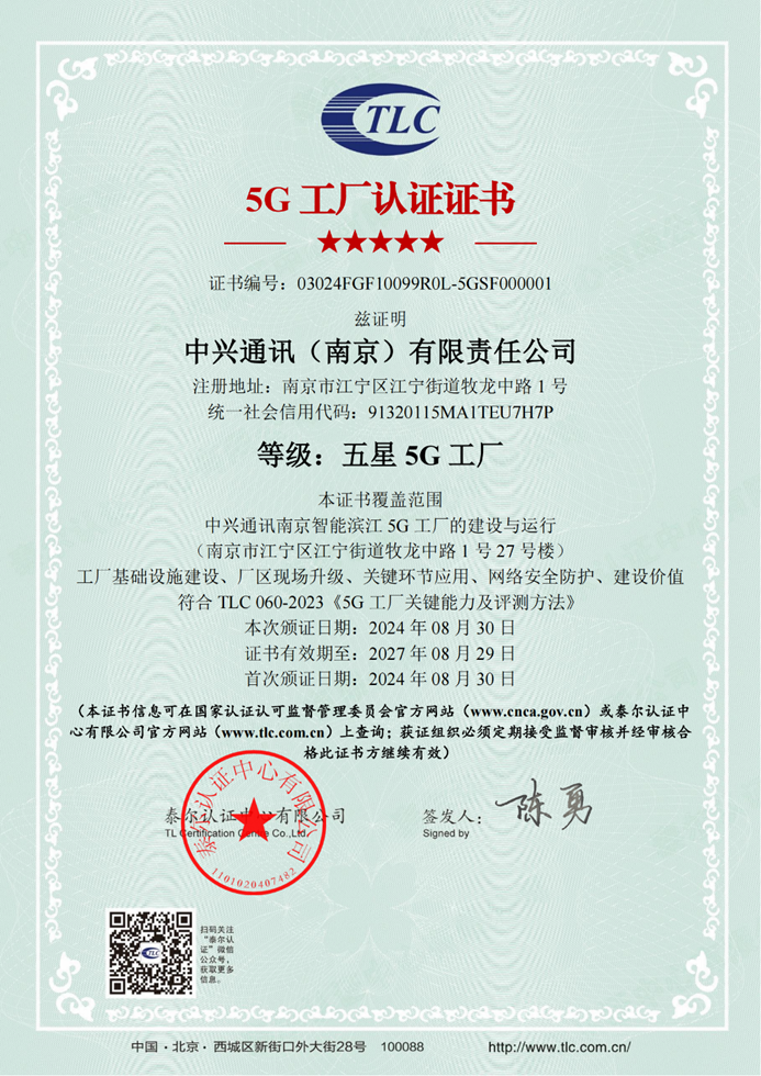 值此工業和信息化部《5G全連接工廠建設指南》發布兩周年,國內首個五星5G工廠——中興通訊南京智能濱江5G工廠(以下簡稱“濱江工廠”)建設完成,通過中國信息通信研究院(簡稱“中國信通院”)泰爾認證中心認證,成為5G技術與電子設備制造業深度融合與全面應用的新標桿。