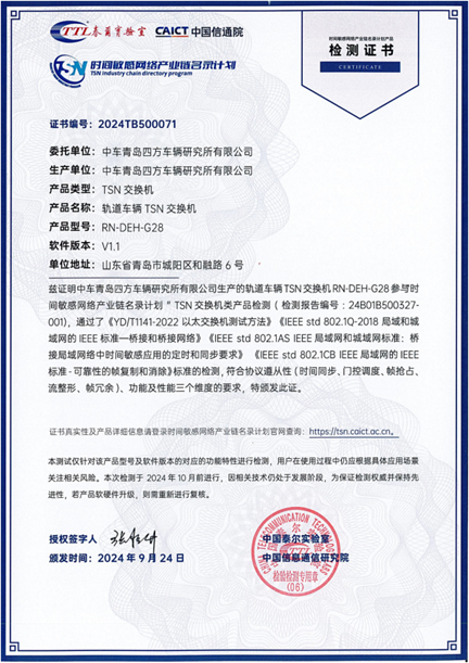 2024年9月,中車青島四方車輛研究所有限公司(以下簡稱中車四方所)研發的RN-DEH-G28型軌道車輛TSN交換機,在互聯網與工業融合創新工信部重點實驗室順利通過名錄計劃產品評測,獲得交換機類檢測證書。