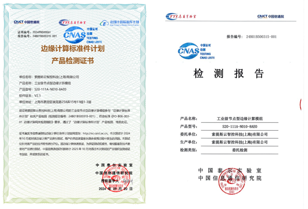 經(jīng)過中國信息通信研究院集中測試,索提斯云智控科技(上海)有限公司自主研發(fā)的工業(yè)級節(jié)點(diǎn)型邊緣計算模組S20順利通過“邊緣計算標(biāo)準(zhǔn)件計劃”產(chǎn)品測試,并已在多個行業(yè)領(lǐng)域?qū)崿F(xiàn)工廠級部署及穩(wěn)定運(yùn)行,助力各行各業(yè)打通IT與OT連接,賦能企業(yè)數(shù)字化轉(zhuǎn)型。