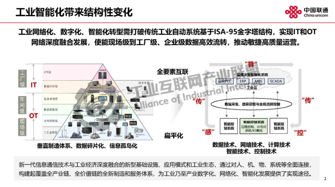 黃蓉介紹,工業(yè)網(wǎng)絡(luò)化、數(shù)字化、智能化轉(zhuǎn)型需打破傳統(tǒng)工業(yè)自動系統(tǒng)基于ISA-95金字塔結(jié)構(gòu),實現(xiàn)IT和OT網(wǎng)絡(luò)深度融合發(fā)展,使能現(xiàn)場級到工廠級、企業(yè)級數(shù)據(jù)高效流轉(zhuǎn),推動敏捷高質(zhì)量運營。工業(yè)數(shù)據(jù)的全面感知、高效傳輸、實時計算和智能管控,需要新一代工業(yè)網(wǎng)絡(luò)和控制系統(tǒng),加速打破原有七國八制基礎(chǔ)設(shè)施,推動統(tǒng)一、開放、協(xié)同的基礎(chǔ)設(shè)施。打造新型工業(yè)網(wǎng)絡(luò),一方面應(yīng)持續(xù)夯實5G+工業(yè)互聯(lián)網(wǎng)等規(guī)模化應(yīng)用,另一方面應(yīng)不斷探索工業(yè)智能化深化應(yīng)用下新的生產(chǎn)模式、交互模式,從而明確對網(wǎng)絡(luò)基礎(chǔ)設(shè)施的新的需求。