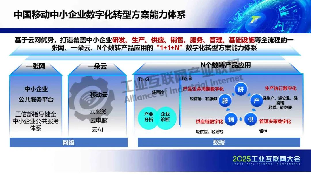 任詠介紹,中國移動中小企業數字化轉型方案能力體系是基于云網優勢,打造覆蓋中小企業研發、生產、供應、銷售、服務、管理、基礎設施等全流程的一張網、一朵云、N個數轉產品應用的“1+1+N”數字化轉型方案能力體系。