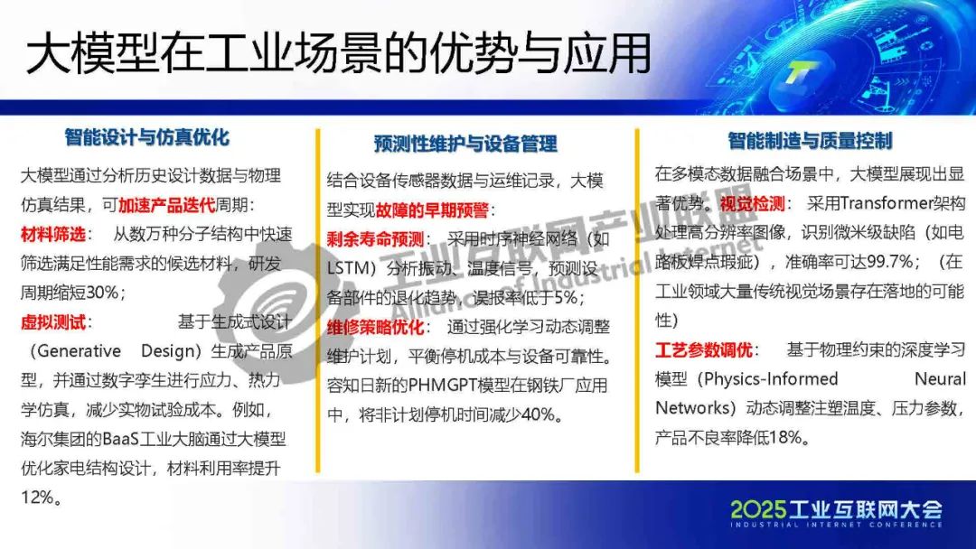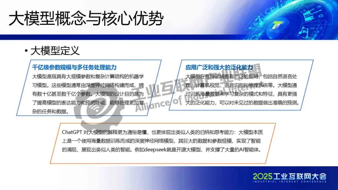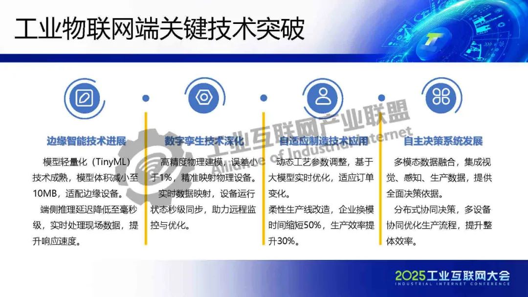 徐明介紹,工業大模型正從概念驗證走向規?;涞兀鋬r值不僅體現在效率提升,更在于重構制造業的知識沉淀與決策范式。在數據安全、模型可信、成本控制等維度建立標準化解決方案,實現技術與產業的雙向賦能。未來,隨著5G-A/6G通信、神經擬態芯片等技術的突破,工業物聯網將形成更高效、安全的智能網絡。企業需關注垂直場景的深度定制,同時平衡技術創新與社會倫理,方能實可持續的智能化轉型。