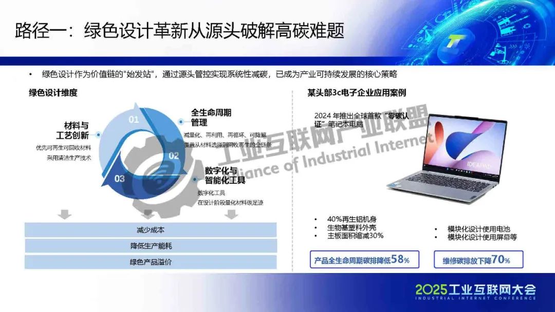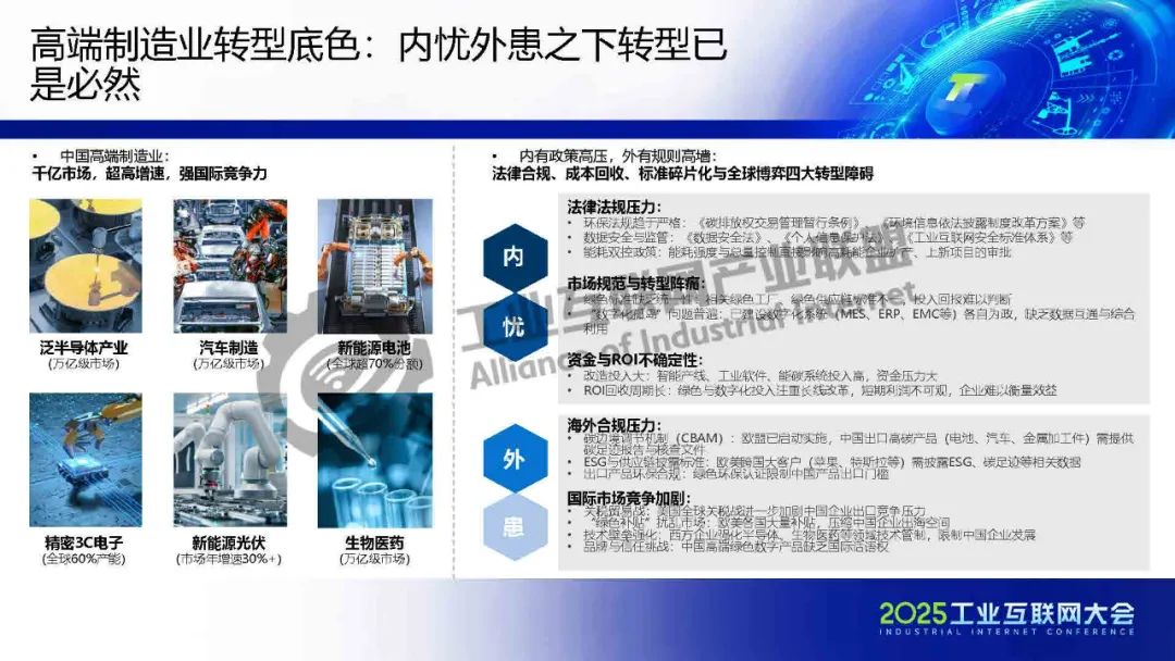 王輝介紹,中國高端制造業在數字化與綠色化協同轉型中面臨內憂外患:國內政策約束、國際碳壁壘、行業降本壓力及龍頭競爭倒逼。當前能碳管理粗放,數字化水平普遍偏低,且存在“能碳割裂”問題,能源與碳管理分屬不同部門,數據協同困難。轉型路徑聚焦綠色產品創新、核心工藝節能、端到端能源精細化管理、碳雙控拉通及產業鏈協同等五大方向。實踐案例顯示,通過AI+數字化工具優化供應鏈、光儲充集成及工藝革新,單產能耗可降40%,碳稅轉為碳資產收益。未來需打破組織壁壘,以數據驅動實現能碳一體化,推動高端制造業綠色競爭力升級。