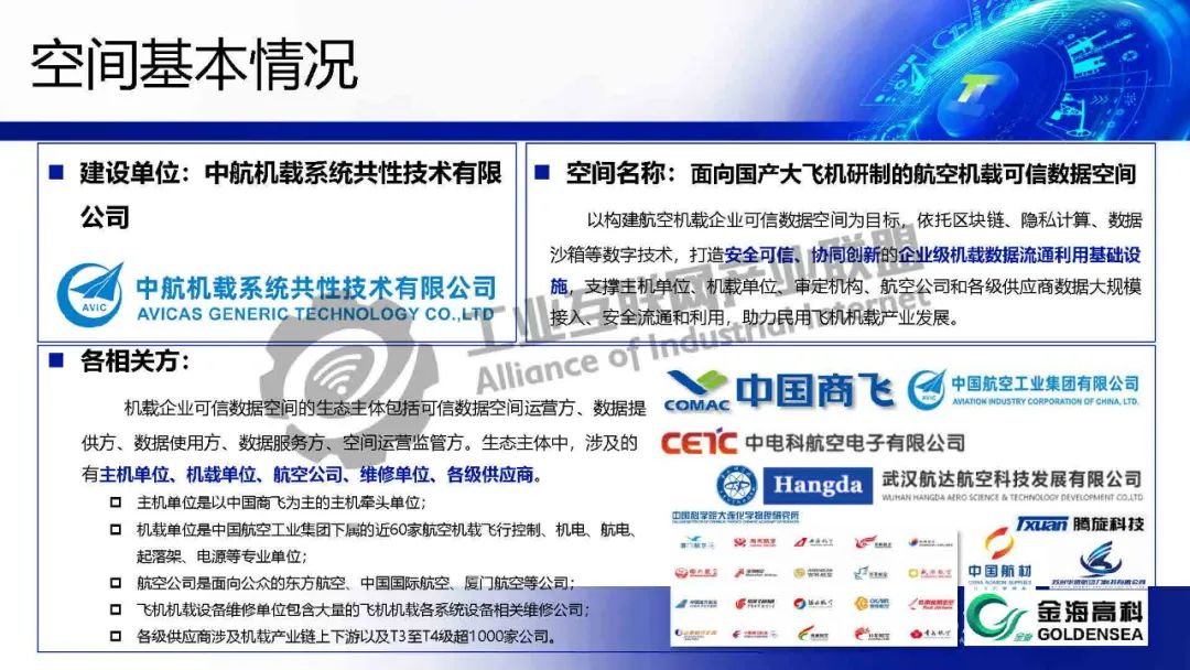 周振興介紹,為貫徹落實國家大飛機戰略,搶抓民機發展的歷史機遇,以C919、AG600、MA700研制、CR929競標等為契機,以產品適航審查為抓手,構建符合民機適航標準的民機可信數據空間,實現研制數據可信流通,促進各相關方協作,建立航空機載數據基礎設施,助力航空機載產業發展,完善國家產業布局。航空機載可信數據空生態主體包括可信數據空間運營方、數據提供方、數據使用方、數據服務方、空間運營監管方,涉及主機單位、機載單位、航空公司、飛機機載設備維修單位、各級供應商。