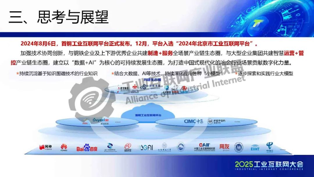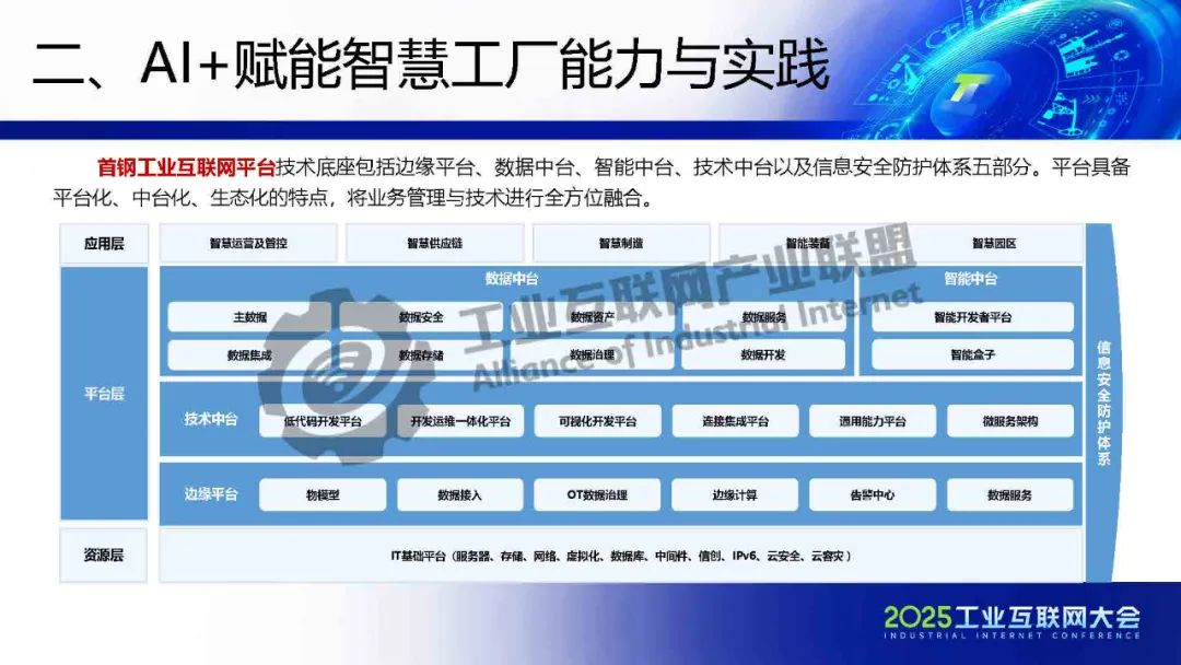 5月22日,在2025工業互聯網大會“工業互聯網平臺高質量發展專題活動”上,北京首鋼自動化信息技術有限公司工業互聯網產業規劃總監樊艷偉發表了《工業互聯網+AI賦能鋼鐵行業智慧工廠建設》的主題演講。