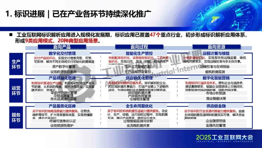 劉巍介紹,標識解析體系已具規模,標識工作向“由建到用”發展,應用場景逐步落地,覆蓋政務管理、行業、公共服務等,標識節點數據貫通、運營管理、應用支撐能力逐步增強。工業互聯網標識解析應用進入規模化發展期,標識應用已覆蓋47個重點行業,初步形成標識解析應用體系,形成9類應用模式,20種典型應用場景。