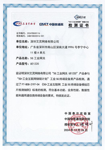 近日,深圳艾靈網(wǎng)絡(luò)有限公司自主研發(fā)的UE1220工業(yè)5G網(wǎng)關(guān)順利通過(guò)第一批“5G+工業(yè)互聯(lián)網(wǎng)”鑄鏈計(jì)劃產(chǎn)品測(cè)試,測(cè)試內(nèi)容涵蓋5G NR基本功能、業(yè)務(wù)性能、數(shù)據(jù)性能和通信類(lèi)終端功能等方面。
