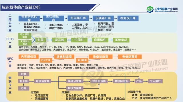 條形碼等技術,但即便是采用射頻電子標簽技術,也無法像在移動通信網絡中那樣,手機等智能終端都可以使用用戶身份識別卡(Subscriber Identification Module,SIM)來隨時隨地的建立可識別的連接。因此,將通用集成電路卡、芯片、模組、終端等信息通信技術引入工業互聯網標識載體,有利于工業互聯網標識相關產品的規模化、標準化和低成本化,進而有利于工業企業供應鏈管理、生產流程管理、產品生命周期管理等核心能力升級。