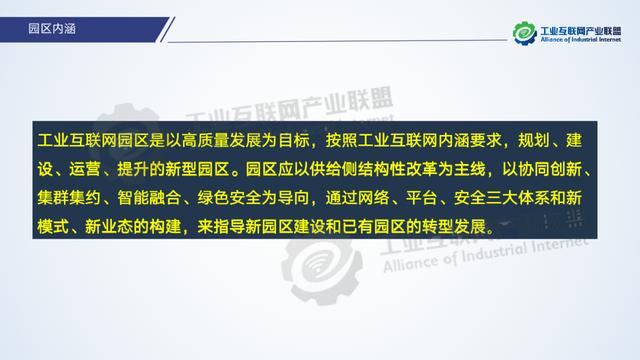 工業(yè)互聯(lián)網(wǎng)園區(qū)是以高質(zhì)量發(fā)展為目標(biāo),按照工業(yè)互聯(lián)網(wǎng)內(nèi)涵要求,規(guī)劃、建設(shè)、運(yùn)營、提升的新型園區(qū)。園區(qū)建設(shè)應(yīng)以供給側(cè)結(jié)構(gòu)性改革為主線,以協(xié)同創(chuàng)新、集群集約、智能融合、綠色安全為導(dǎo)向,通過網(wǎng)絡(luò)、平臺(tái)、安全三大體系和新模式、新業(yè)態(tài)的構(gòu)建,來指導(dǎo)新園區(qū)建設(shè)和已有園區(qū)的轉(zhuǎn)型發(fā)展。