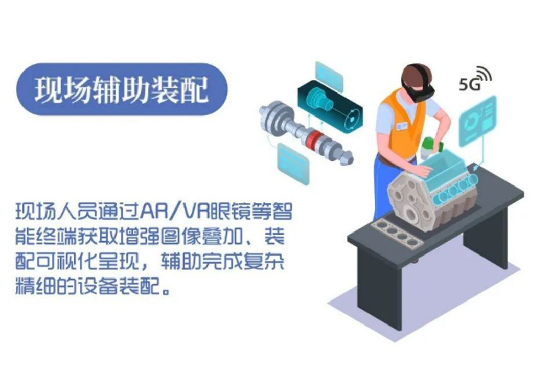 通過內置 5G 模組或部署5G網關等設備,實現 AR/VR 眼鏡、智能手機、PAD 等智能終端的5G網絡接入,采集現場圖像、視頻、聲音等數據,通過5G網絡實時傳輸至現場輔助裝配系統,系統對數據進行分析處理,生成生產 4 輔助信息,通過 5G 網絡下發至現場終端,實現操作步驟的增強圖像疊加、裝配環節的可視化呈現,幫助現場人員進行復雜設備或精細化設備的裝配。另外,專家的指導信息、設備操作說明書、圖紙、文件等也可以通過5G網絡實時同步到現場終端,現場裝配人員簡單培訓后即可上崗,有效提升現場操作人員的裝配水平,實現裝配過程智能化,提升裝配效率。