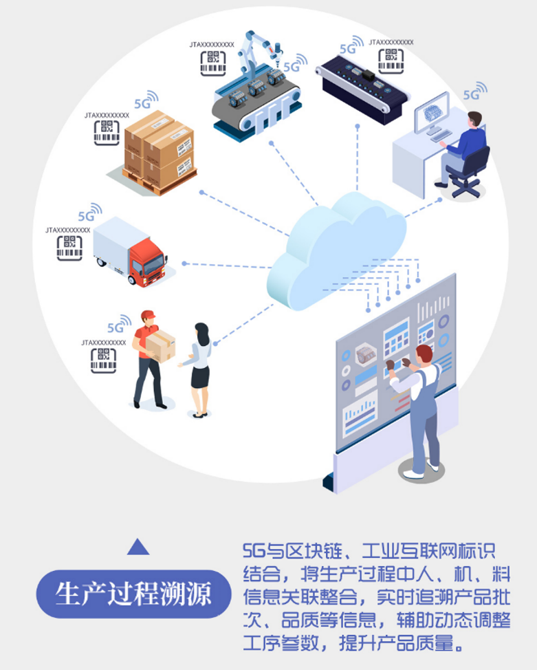 將企業(yè)生產(chǎn)現(xiàn)場(chǎng)的掃碼槍、工業(yè)相機(jī)、攝像頭、刷卡機(jī)等設(shè)備接入5G網(wǎng)絡(luò),將生產(chǎn)過程每個(gè)工序的物料編碼、作業(yè)人員、生產(chǎn)設(shè)備狀態(tài)等信息實(shí)時(shí)傳輸?shù)皆破脚_(tái)。云平臺(tái)將產(chǎn)品生產(chǎn)過程中的人、機(jī)、料信息進(jìn)行關(guān)聯(lián)整合形成溯源數(shù)據(jù)庫(kù),運(yùn)用區(qū)塊鏈、標(biāo)識(shí)等技術(shù),實(shí)現(xiàn)產(chǎn)品關(guān)鍵要素和生產(chǎn)過程追溯。通過實(shí)時(shí)追溯批次、品質(zhì)等原料信息,可動(dòng)態(tài)調(diào)整后道工序參數(shù),提升產(chǎn)品質(zhì)量。
