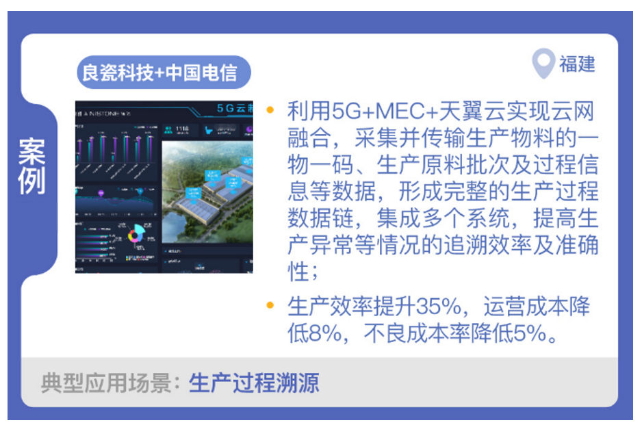 福建良瓷科技有限公司與中國(guó)電信合作,開展了“九牧永春5G智慧工廠”項(xiàng)目建設(shè),實(shí)現(xiàn)了生產(chǎn)過程溯源場(chǎng)景的應(yīng)用。自主研發(fā)標(biāo)準(zhǔn)化四碼合一系統(tǒng),并對(duì)衛(wèi)浴陶瓷在成型、干燥、施釉、燒成、質(zhì)檢、包裝等生產(chǎn)環(huán)節(jié)設(shè)備進(jìn)行5G智能化改造。利用5G+MEC+天翼云實(shí)現(xiàn)云網(wǎng)融合,采集生產(chǎn)物料的一物一碼、生產(chǎn)原料批次及過程信息等數(shù)據(jù),實(shí)時(shí)傳輸至云平臺(tái),形成完整的生產(chǎn)過程數(shù)據(jù)鏈。同時(shí),集成MES、數(shù)據(jù)采集與監(jiān)視控制系統(tǒng)(SCADA)、自動(dòng)導(dǎo)航車輛(AGV)系統(tǒng)、倉(cāng)庫(kù)管理系統(tǒng)(WMS)等多個(gè)系統(tǒng),可追溯到生產(chǎn)過程中的人、機(jī)、料、法、環(huán)等相關(guān)信息,極大地提高了生產(chǎn)異常等情況的追溯效率及追溯準(zhǔn)確性。該項(xiàng)目上線后,生產(chǎn)效率提升35%,單位產(chǎn)值能耗降低7%,運(yùn)營(yíng)成本降低8%,不良成本率降低5%。