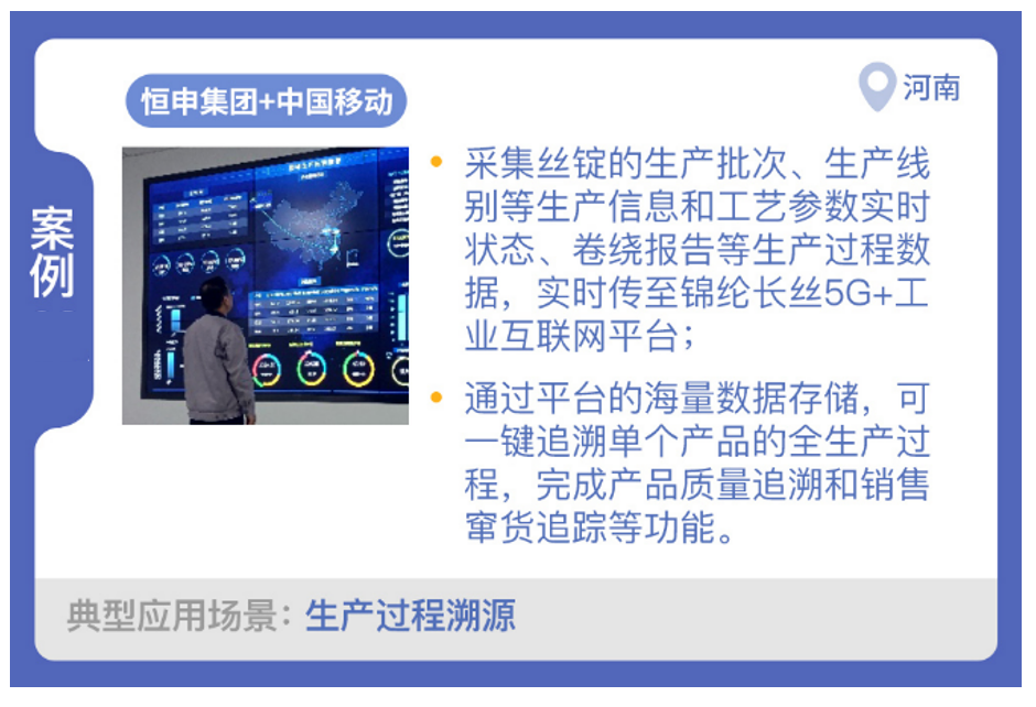 恒申集團(tuán)化纖板塊河南基地與中國(guó)移動(dòng)合作,開展了“錦綸長(zhǎng)絲5G+工業(yè)互聯(lián)網(wǎng)平臺(tái)”項(xiàng)目建設(shè),實(shí)現(xiàn)了生產(chǎn)過程溯源場(chǎng)景的應(yīng)用。采集絲錠的生產(chǎn)批次、生產(chǎn)線別、紡位等生產(chǎn)信息和工藝參數(shù)實(shí)時(shí)狀態(tài)、卷繞報(bào)告、斷絲報(bào)告、報(bào)警信息等生產(chǎn)過程數(shù)據(jù),通過5G網(wǎng)絡(luò)實(shí)時(shí)傳輸至錦綸長(zhǎng)絲5G+工業(yè)互聯(lián)網(wǎng)平臺(tái)。在平衡間,基于5G+射頻識(shí)別技術(shù)(RFID)讀取絲車信息,記錄每一部絲車的周轉(zhuǎn)位置以及時(shí)間管控情況,結(jié)合MES記錄的質(zhì)檢結(jié)果、人員等信息,實(shí)現(xiàn)生產(chǎn)要素前后貫通;在包裝環(huán)節(jié),利用工業(yè)相機(jī)對(duì)產(chǎn)品內(nèi)標(biāo)二維碼信息進(jìn)行采集,通過5G網(wǎng)絡(luò)傳輸至云端數(shù)據(jù)庫(kù)進(jìn)行校驗(yàn),判斷是否符合包裝規(guī)格要求。通過平臺(tái)的海量數(shù)據(jù)存儲(chǔ)功能,可一鍵追溯單個(gè)產(chǎn)品的全生產(chǎn)過程,實(shí)現(xiàn)包括質(zhì)量計(jì)劃、過程控制、異常處理、管理決策和問題關(guān)閉等環(huán)節(jié)在內(nèi)的質(zhì)量閉環(huán)控制,完成產(chǎn)品質(zhì)量追溯和銷售竄貨追蹤等功能。