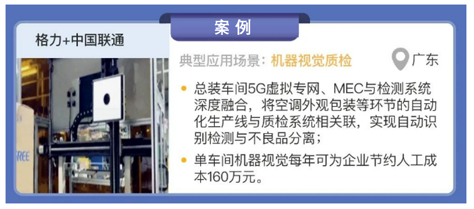 格力與中國聯(lián)通合作,在廣東省利用5G技術(shù)部署了機(jī)器視覺質(zhì)檢場(chǎng)景的應(yīng)用。在格力電器的總裝車間,聯(lián)通以一套獨(dú)立 MEC 為格力打造了工業(yè)虛擬專網(wǎng),實(shí)現(xiàn)生產(chǎn)控制網(wǎng)與生產(chǎn)管理網(wǎng)融合,在模擬場(chǎng)景中基于樣本訓(xùn)練建立數(shù)據(jù)模型,在需要自動(dòng)檢測(cè)的工位上安裝5G高清攝像頭,與自動(dòng)化生產(chǎn)線同頻聯(lián)調(diào),在實(shí)際生產(chǎn)中利用5G網(wǎng)絡(luò)將待檢內(nèi)容自動(dòng)拍照,照片視頻流上傳至部署在MEC平臺(tái)的機(jī)器視覺質(zhì)檢應(yīng)用,運(yùn)用圖形處理單元(GPU)大算力資源與數(shù)據(jù)模型做實(shí)時(shí)比對(duì)分析檢查,實(shí)現(xiàn)設(shè)備自動(dòng)識(shí)別,檢測(cè)結(jié)果以毫秒級(jí)時(shí)延返回現(xiàn)場(chǎng)端,自動(dòng)化生產(chǎn)線與質(zhì)檢系統(tǒng)關(guān)聯(lián)做出不良品分離操作。5G 虛擬專網(wǎng)、MEC 平臺(tái)與檢測(cè)系統(tǒng)深度融合,為機(jī)器視覺質(zhì)檢應(yīng)用的數(shù)據(jù)傳輸和信息處理提供了強(qiáng)大保障。目前格力已在其總部總裝生產(chǎn)線的空調(diào)外觀包裝、壓縮機(jī)線序、空調(diào)自動(dòng)電氣安全測(cè)試等環(huán)節(jié)中部署了5G機(jī)器視覺質(zhì)檢應(yīng)用,單車間機(jī)器視覺每年可為企業(yè)節(jié)約人工成本 160 萬元。