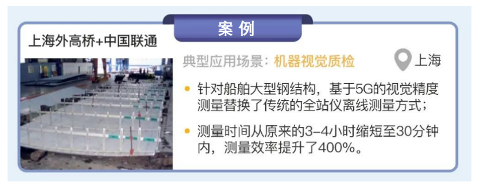 上海市外高橋造船有限公司與中國聯(lián)通合作,在上海市開展“5G+工業(yè)互聯(lián)網(wǎng)”在船舶行業(yè)的落地應(yīng)用,搭建 5G 專網(wǎng),融合 MEC 技術(shù),實(shí)現(xiàn)了基于5G的機(jī)器視覺檢測(cè)場(chǎng)景的應(yīng)用。使用工業(yè)相機(jī)+靶點(diǎn)的測(cè)量模式進(jìn)行大型鋼結(jié)構(gòu)精度測(cè)量,通過 5G 專網(wǎng)及邊緣云,實(shí)時(shí)回傳、解算現(xiàn)場(chǎng)拍攝圖片,生成點(diǎn)位文件。基于5G 的視覺精度測(cè)量替換了傳統(tǒng)的全站儀離線測(cè)量方式,將測(cè)量時(shí)間從原來的3-4小時(shí),縮短至 30 分鐘內(nèi),測(cè)量效率提升了400%。