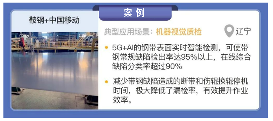 鞍鋼與中國移動(dòng)合作,在遼寧省開展了“基于5G 的機(jī)器視覺帶鋼表面檢測(cè)平臺(tái)研發(fā)與應(yīng)用”項(xiàng)目建設(shè),實(shí)現(xiàn)了機(jī)器視覺質(zhì)檢場(chǎng)景的應(yīng)用。在機(jī)器視覺質(zhì)檢方面,通過部署工業(yè)相機(jī)拍攝高清圖片、采集質(zhì)檢數(shù)據(jù),利用 5G 網(wǎng)絡(luò)將采集到的冷軋現(xiàn)場(chǎng)4K/8K等高清圖像數(shù)據(jù)回傳至操作室平臺(tái),通過平臺(tái)的視覺AI 分析能力對(duì)圖像進(jìn)行處理分析,完成帶鋼表面缺陷的實(shí)時(shí)檢測(cè);同時(shí),帶鋼軋制速度極高,通過帶鋼表面的反光斑馬條紋反饋帶鋼的平整度,用于帶鋼生產(chǎn)質(zhì)量的實(shí)時(shí)檢測(cè),為張力輥等調(diào)節(jié)提供依據(jù)。方案部署完成后,帶鋼常規(guī)缺陷檢出率達(dá)95%以上,在線綜合缺陷分類率超過 90%,提高成材率的同時(shí)減少了帶鋼缺陷造成的斷帶和傷輥換輥停機(jī)時(shí)間。