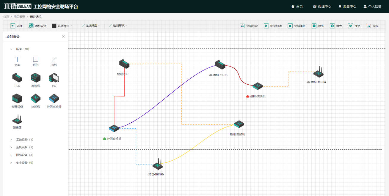 根據(jù)劇情所設(shè)定的工控系統(tǒng)典型場(chǎng)景進(jìn)行仿真部署,對(duì)工控系統(tǒng)設(shè)備、網(wǎng)絡(luò)、安全產(chǎn)品進(jìn)行布置并完成相應(yīng)參數(shù)配置;