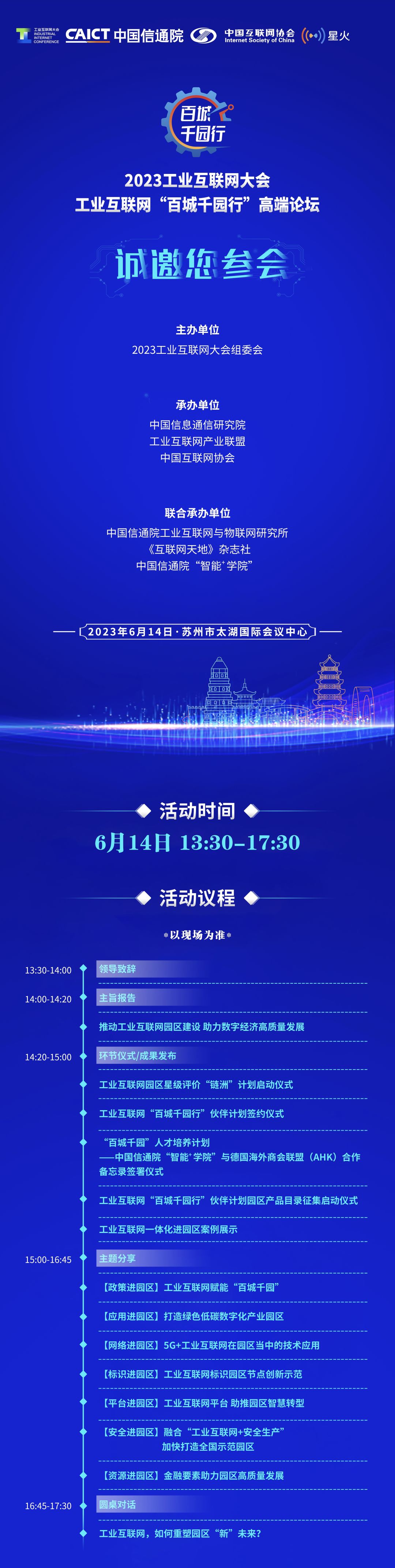 為貫徹黨的二十大精神,加快落實“十四五”規(guī)劃綱要關(guān)于“穩(wěn)妥發(fā)展工業(yè)互聯(lián)網(wǎng)”的相關(guān)要求,深入實施《工業(yè)互聯(lián)網(wǎng)創(chuàng)新發(fā)展行動計劃(2021-2023年)》,大力推進工業(yè)互聯(lián)網(wǎng)規(guī)模化應(yīng)用,促進產(chǎn)業(yè)數(shù)字化轉(zhuǎn)型,為加速我國新型工業(yè)化發(fā)展提供關(guān)鍵支撐, 由工業(yè)和信息化部、江蘇省人民政府主辦,中國信息通信研究院、江蘇省工業(yè)和信息化廳、江蘇省通信管理局、蘇州市人民政府、工業(yè)互聯(lián)網(wǎng)產(chǎn)業(yè)聯(lián)盟、中國通信學(xué)會、中國互聯(lián)網(wǎng)協(xié)會聯(lián)合承辦的【2023工業(yè)互聯(lián)網(wǎng)大會】,將于2023年6月14-16日在江蘇省蘇州市舉辦,本次大會由開幕式、高峰對話、高端論壇、學(xué)術(shù)大會、成果報告會、成果展示、現(xiàn)場調(diào)研、企業(yè)路演等40余場豐富的產(chǎn)業(yè)活動組成。