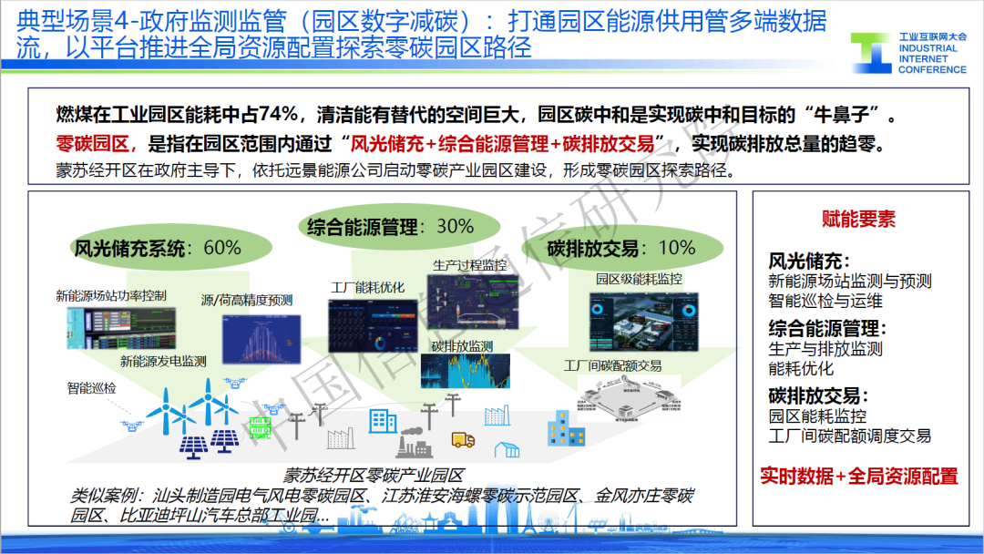 四是園區(qū)數(shù)字減碳,某產(chǎn)業(yè)園區(qū)通過“風(fēng)光儲(chǔ)充+綜合能源管理+碳排放交易”實(shí)現(xiàn)零碳園區(qū)建設(shè)。在發(fā)電端,通過數(shù)據(jù)建模優(yōu)化,通過新能源發(fā)電監(jiān)測(cè)、源網(wǎng)荷儲(chǔ)調(diào)度等方式,優(yōu)化發(fā)電調(diào)度的效率;在用電端,通過工廠能耗優(yōu)化、生產(chǎn)過程管控等方式直接減少生產(chǎn)中的碳排放;在監(jiān)管端,提供碳監(jiān)控、碳核驗(yàn)、碳交易等服務(wù),實(shí)現(xiàn)資源的全局配置。