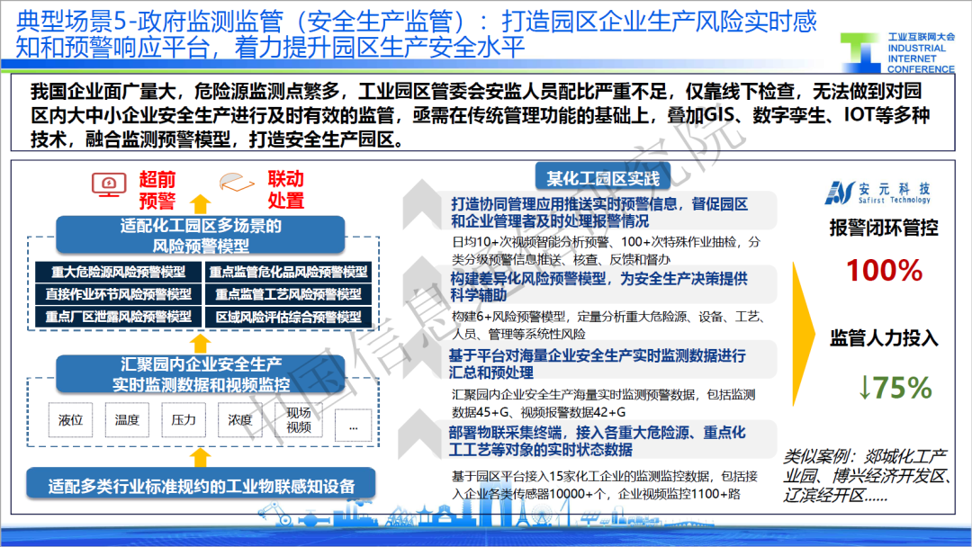 五是安全生產(chǎn)監(jiān)管,針對(duì)危險(xiǎn)源監(jiān)測(cè)點(diǎn)繁多,工業(yè)園區(qū)管委會(huì)安監(jiān)人員配比嚴(yán)重不足,線下檢查困難的問題,某服務(wù)商打造化工園區(qū)云平臺(tái),部署超過10000個(gè)工業(yè)傳感器,實(shí)現(xiàn)園區(qū)內(nèi)液位、溫度、壓力、濃度等數(shù)據(jù)的實(shí)時(shí)監(jiān)測(cè),同時(shí)適配作業(yè)環(huán)節(jié)、廠區(qū)泄露、工藝監(jiān)管的模型,實(shí)現(xiàn)園區(qū)預(yù)警與處置。