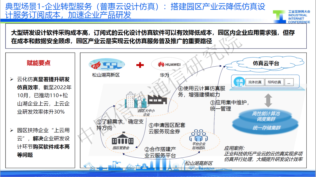 “典型場(chǎng)景”一是普惠云設(shè)計(jì)仿真,針對(duì)中小企業(yè)研發(fā)工具成本高的問題,某服務(wù)商通過建立仿真云平臺(tái),一方面提供低成本的仿真工具,并基于平臺(tái)實(shí)現(xiàn)統(tǒng)一版本管理,降低企業(yè)使用成本。另一方面,打造高性能計(jì)算與存儲(chǔ)管理設(shè)施,為仿真工具提供算力支撐。目前,該應(yīng)用已覆蓋110家中小企業(yè),實(shí)現(xiàn)研發(fā)效率提升30%。