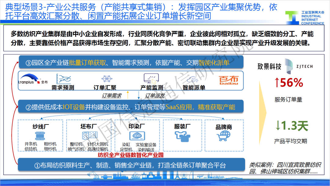 三是產(chǎn)能共享式集銷,紡織企業(yè)同質(zhì)化競爭嚴(yán)重,缺乏細(xì)致的分工、產(chǎn)能分散,主要靠低價(jià)格產(chǎn)品獲得市場(chǎng)生存空間。某服務(wù)商針對(duì)紡織企業(yè)痛點(diǎn)打造集采集銷平臺(tái),將訂單需求與企業(yè)生產(chǎn)拉通,通過智能化派單優(yōu)化提高資源配置效率,應(yīng)用過程中有效提升企業(yè)訂單數(shù)量56%。