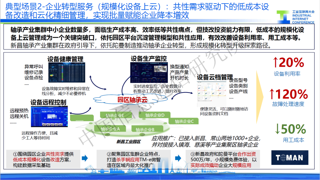 二是規(guī)模化設(shè)備上云,針對(duì)面向軸承產(chǎn)業(yè)集群中小企業(yè)數(shù)量多,設(shè)備停機(jī)率高的共性痛點(diǎn),某服務(wù)商打造園區(qū)軸承云,提供設(shè)備遠(yuǎn)程控制、設(shè)備健康管理、設(shè)備生產(chǎn)監(jiān)控等一系列殺手锏應(yīng)用,通過對(duì)設(shè)備的管控有效減少停機(jī)時(shí)間,使得軸承行業(yè)綜合成本較改造前下降12%,利潤率也從改造前的4%提升到了8%。