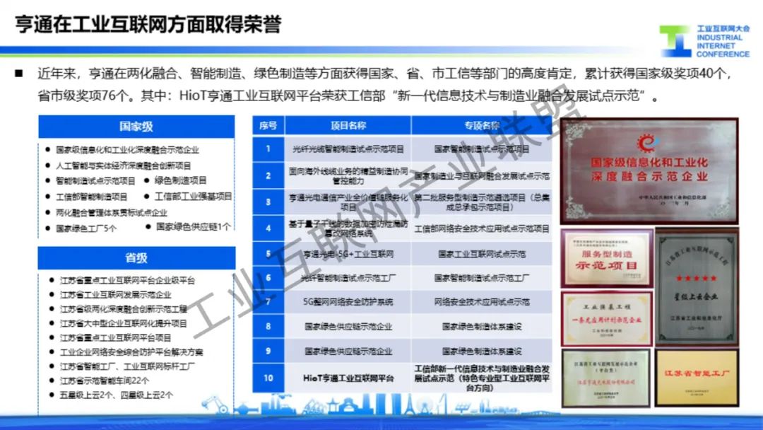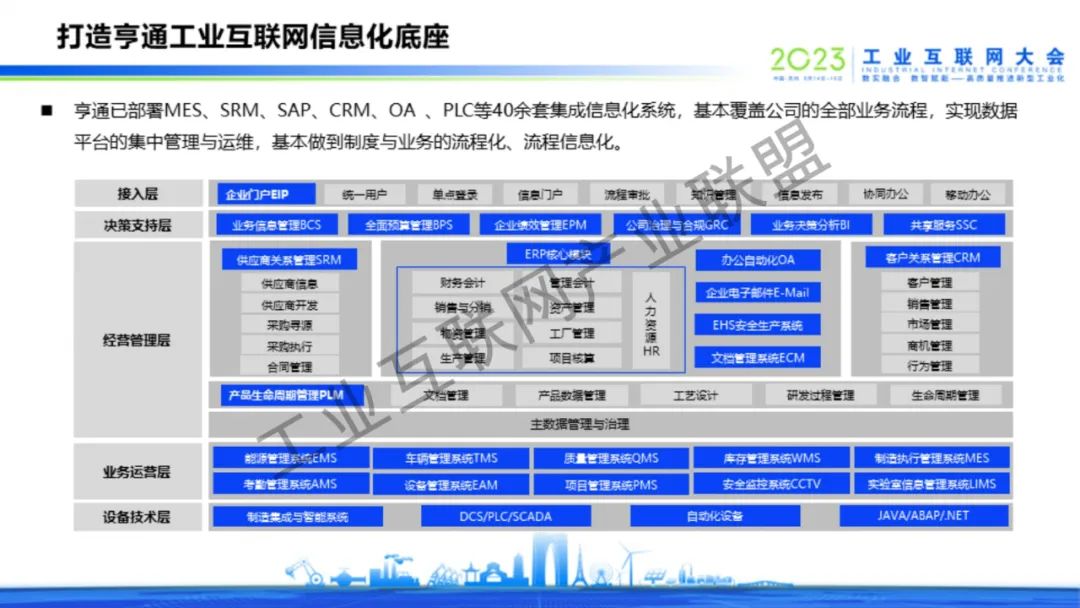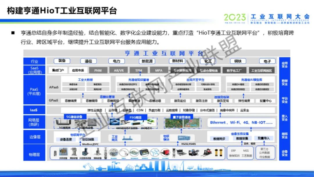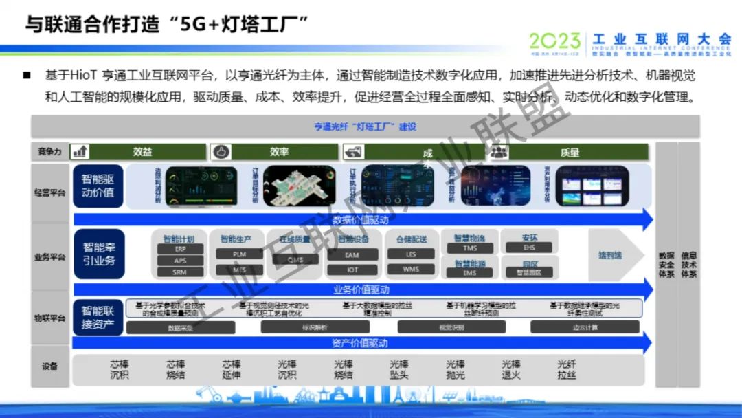 6月16日上午,亨通集團(tuán)執(zhí)行總裁錢建林以“全面擁抱工業(yè)互聯(lián)網(wǎng),激發(fā)企業(yè)發(fā)展新動(dòng)能”為題,在2023工業(yè)互聯(lián)網(wǎng)大會(huì)工業(yè)互聯(lián)網(wǎng)趨勢洞察與路徑探索高峰對話上作主題演講。結(jié)合亨通在工業(yè)互聯(lián)網(wǎng)賦能企業(yè)數(shù)字化、信息化、智能化發(fā)展的實(shí)踐經(jīng)驗(yàn)和成果案例,依托5G+工業(yè)互聯(lián)網(wǎng)的融合應(yīng)用、縱深發(fā)展優(yōu)勢,在內(nèi)率先實(shí)現(xiàn)智能化改造數(shù)字化升級,打造了一批批智能制造示范工廠、工業(yè)互聯(lián)網(wǎng)平臺,為企業(yè)高質(zhì)量發(fā)展提供了新模式,增添了新動(dòng)能;在外憑借工業(yè)互聯(lián)網(wǎng)的先進(jìn)技術(shù)優(yōu)勢,重點(diǎn)打造亨通HioT工業(yè)互聯(lián)網(wǎng)平臺,以產(chǎn)業(yè)數(shù)字化迭代升級賦能行業(yè)高質(zhì)量發(fā)展。錢建林表示,亨通HioT工業(yè)互聯(lián)網(wǎng)平臺以“江蘇亨通數(shù)字智能科技有限公司”(簡稱:亨通數(shù)科)為載體,從工業(yè)互聯(lián)網(wǎng)賦能智能制造、綠色生產(chǎn)、智慧產(chǎn)業(yè)園區(qū)、中小企業(yè)數(shù)字化水平等領(lǐng)域,聚焦行業(yè)痛點(diǎn),為13個(gè)行業(yè)提供67項(xiàng)最佳實(shí)踐解決方案,將亨通的經(jīng)驗(yàn)和成果分享給各行業(yè)、各企業(yè)。未來,亨通將加快構(gòu)建更高水平、更廣范圍、更深層次的制造業(yè)數(shù)字化發(fā)展格局,助力形成具有全球競爭力的“5G+工業(yè)互聯(lián)網(wǎng)”產(chǎn)業(yè)集群,推動(dòng)加快建設(shè)制造強(qiáng)國、網(wǎng)絡(luò)強(qiáng)國,在中國式現(xiàn)代化新實(shí)踐中再作新的更大貢獻(xiàn)。