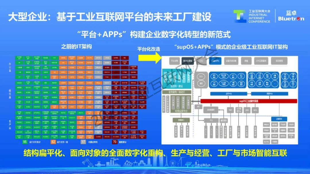 對于大型企業來講,過去二十年已經完成了基本的自動化、信息化建設,但是整個系統都是煙囪式的,沒有形成頂層架構,不管是數據,還是數據應用都在不斷推翻重來。通過引入supOS工業操作系統,原本各自獨立的工業軟件變成了運行在統一平臺上的工業APP。這一方式讓大型企業的結構更加扁平化,各種業務系統可以有效連接,工廠和市場進行了互聯。
