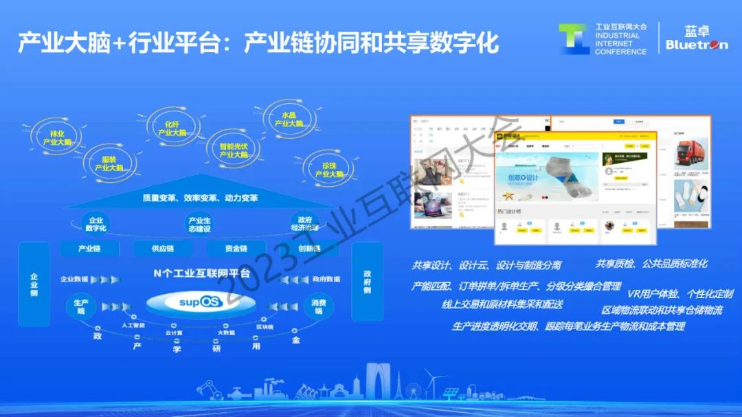 另一方面,隨著國際產業形勢的變化,來自于產業鏈、供應鏈協同和共享的數字化需求越來越強烈。依托工業操作系統實現強鏈補鏈,也是藍卓的重點方向之一。目前,藍卓重點參與了包括化纖產業大腦、光伏產業大腦、服裝產業大腦、襪業產業大腦、水晶產業大腦的建設。通過產業大腦操作系統的形式拉動整個產業鏈的資源,探索包括共享設計、共享質檢、產能匹配、訂單撮合、供應鏈協同在內的各種創新模式。
