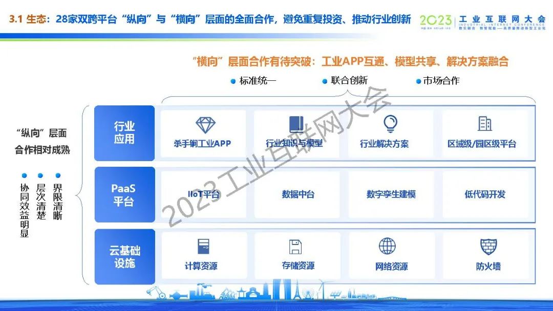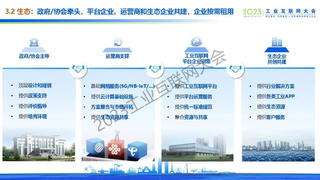 武愛斌介紹了雙跨平臺未來走深向實發展的三類挑戰:工業賦能深度待提升、互聯網技術融合待加強和互聯網模式探索待深化。提出了促進雙跨平臺創新、可持續發展的策略,建議數據要素和模型的價值要“走出圍墻”,賦能產業鏈伙伴和區域數字經濟,28家雙跨平臺“縱向”與“橫向”層面的全面合作,避免重復投資、推動行業創新,提出由政府/協會牽頭,平臺企業、運營商和生態企業共建,企業按需租用的新生態。