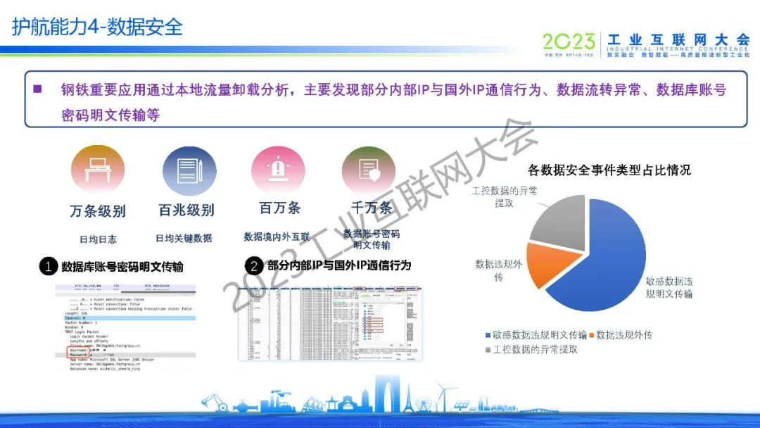 “鋼鐵重要應(yīng)用通過本地流量卸載分析,主要發(fā)現(xiàn)部分內(nèi)部IP與國外IP通信行為、數(shù)據(jù)流轉(zhuǎn)異常、數(shù)據(jù)庫賬號(hào)密碼明文傳輸?shù)??!?/p>