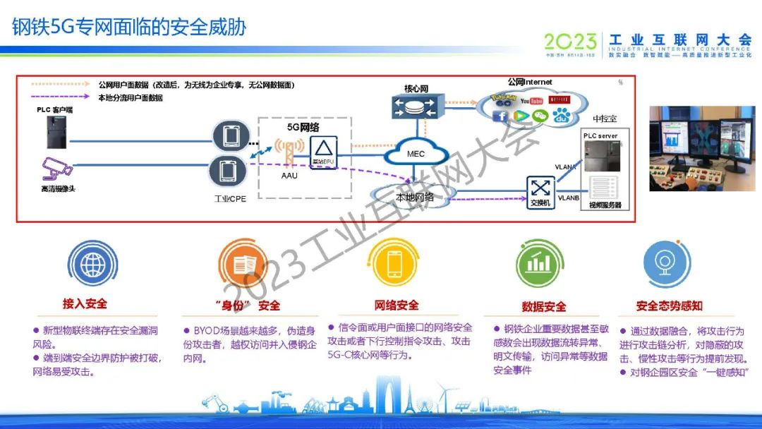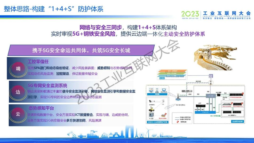 林飛指出,5G作為“新基建”七大領(lǐng)域之首,推動(dòng)和支撐邊緣計(jì)算、云計(jì)算、大數(shù)據(jù)、人工智能、工業(yè)互聯(lián)網(wǎng)、數(shù)字孿生等新一代信息技術(shù)在鋼鐵企業(yè)落地生根,賦能鋼鐵行業(yè)數(shù)字化、智能化轉(zhuǎn)型發(fā)展。當(dāng)前,鋼鐵5G專網(wǎng)面臨多種安全威脅,需要建立起網(wǎng)絡(luò)與安全三同步的規(guī)劃,構(gòu)建“1+4+S”體系架構(gòu),從云、邊、端一體化建立起主動(dòng)安全防護(hù)的體系。