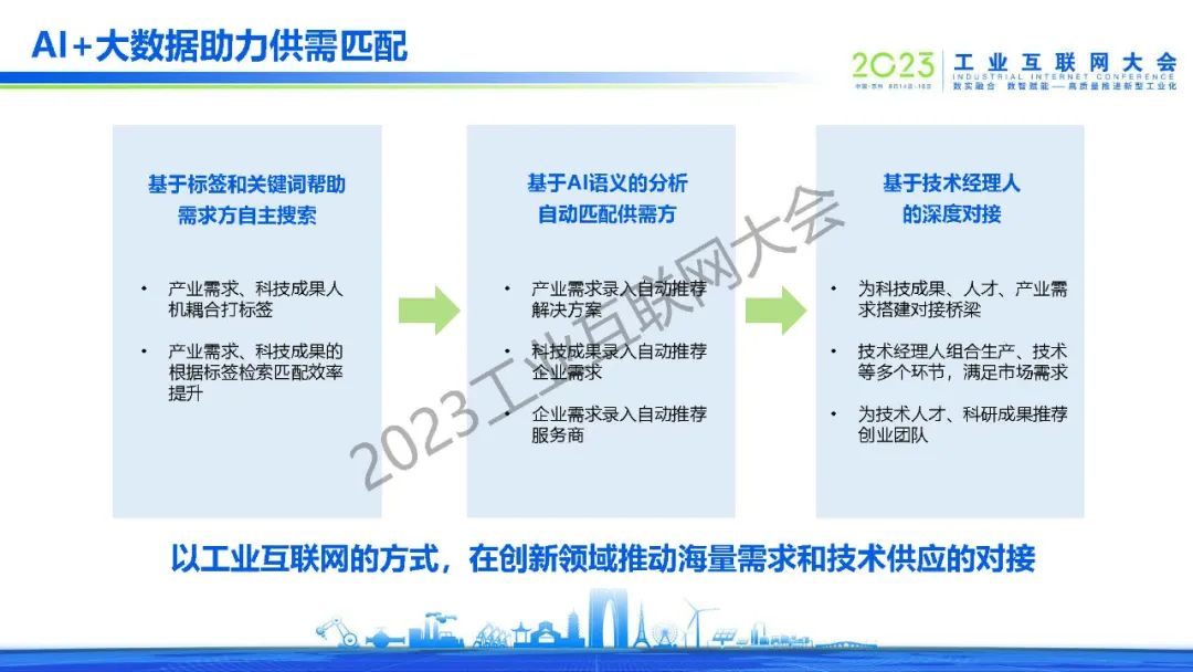“AI+大數(shù)據(jù)助力供需匹配,通過基于標簽和關鍵詞幫助需求方自主搜索、基于AI語義的分析自動匹配供需方和基于技術經(jīng)理人的深度對接三個方式,在創(chuàng)新領域推動海量需求和技術供應的對接。“