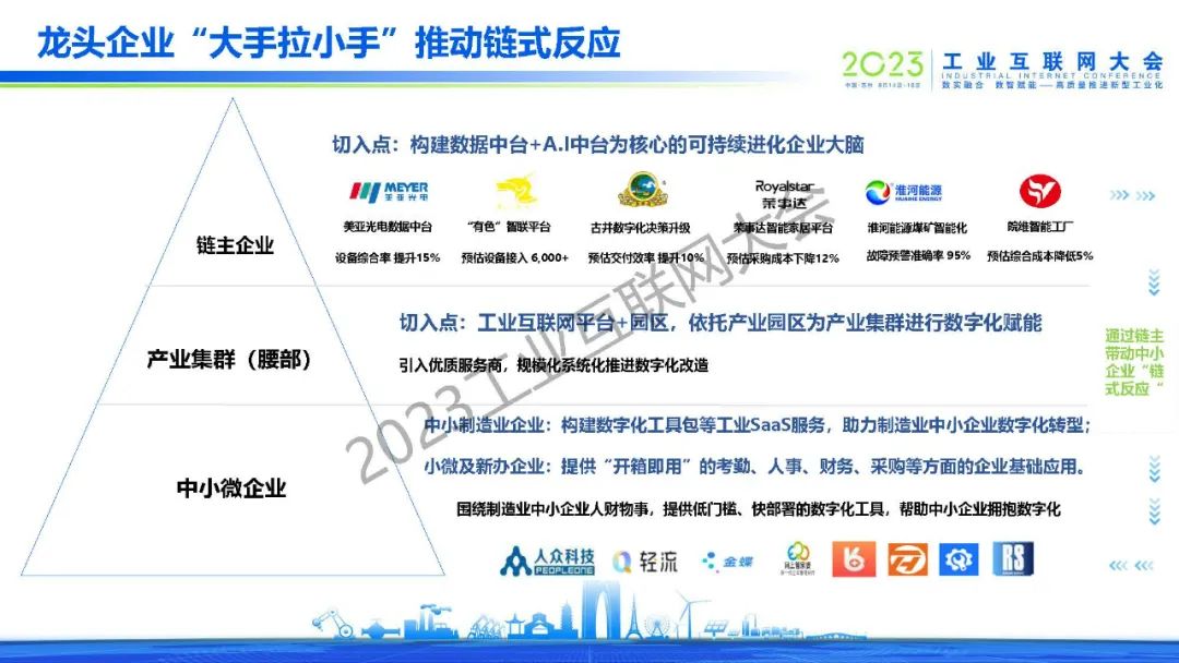 金暉指出,龍頭企業(yè)構(gòu)建數(shù)據(jù)中臺+A.I中臺為核心的可持續(xù)進化企業(yè)大腦,產(chǎn)業(yè)集群通過工業(yè)互聯(lián)網(wǎng)平臺+園區(qū),依托產(chǎn)業(yè)園區(qū)為產(chǎn)業(yè)集群進行數(shù)字化賦能,中小制造業(yè)企業(yè)可構(gòu)建數(shù)字化工具包等工業(yè)SaaS服務,助力企業(yè)數(shù)字化轉(zhuǎn)型。