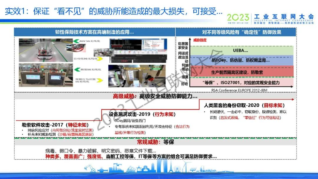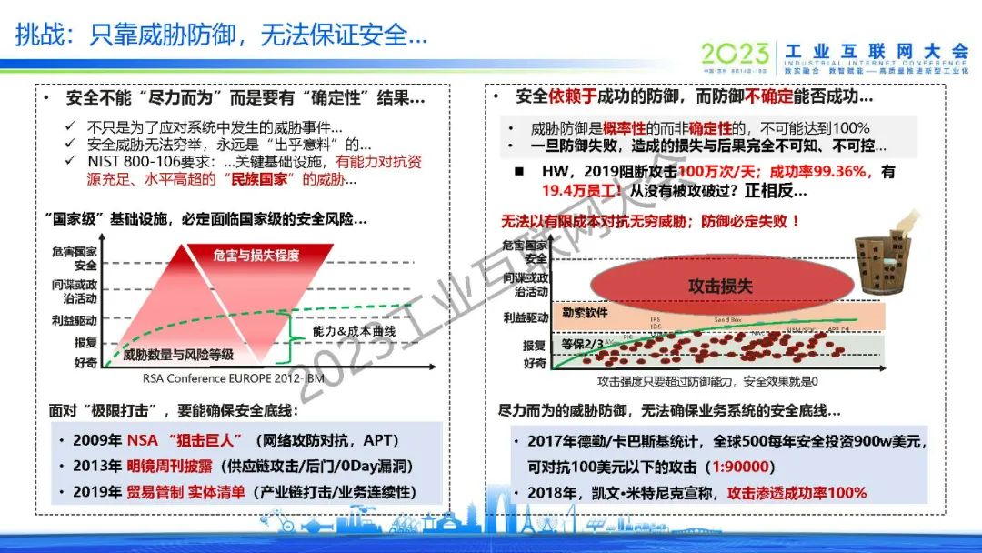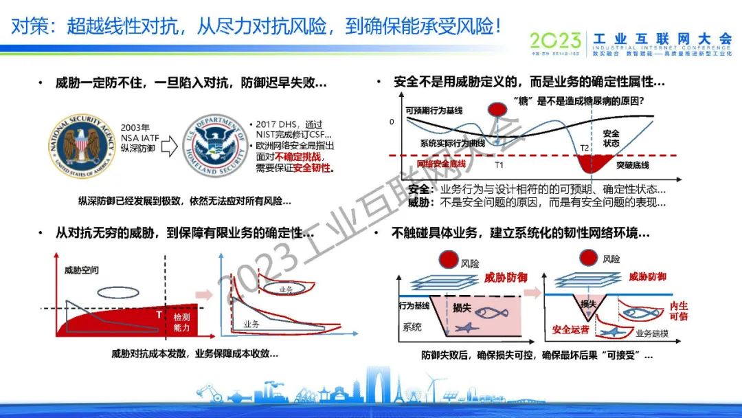 王雨晨指出,安全是產(chǎn)業(yè)數(shù)字化轉(zhuǎn)型中的“馬六甲海峽”,越有價(jià)值的系統(tǒng),面臨的安全風(fēng)險(xiǎn)越大。對抗策略也需要超越線性對抗,從盡力對抗風(fēng)險(xiǎn),到確保能承受風(fēng)險(xiǎn)。建立可信網(wǎng)絡(luò):從一維線性的威脅防御,到三維系統(tǒng)性的安全保障,前置隔離區(qū)爭取最好情況,內(nèi)網(wǎng)微隔離確保最壞結(jié)果可接受,運(yùn)營管理區(qū)實(shí)現(xiàn)動態(tài)安全。