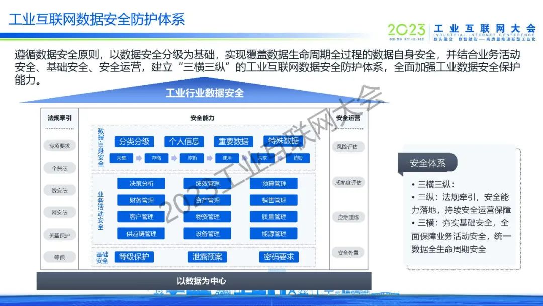 “遵循數(shù)據(jù)安全原則,以數(shù)據(jù)安全分級為基礎(chǔ),實(shí)現(xiàn)覆蓋數(shù)據(jù)生命周期全過程的數(shù)據(jù)自身安全,并結(jié)合業(yè)務(wù)活動安全、基礎(chǔ)安全、安全運(yùn)營,建立“三橫三縱”的工業(yè)互聯(lián)網(wǎng)數(shù)據(jù)安全防護(hù)體系,全面加強(qiáng)工業(yè)數(shù)據(jù)安全保護(hù)能力。”