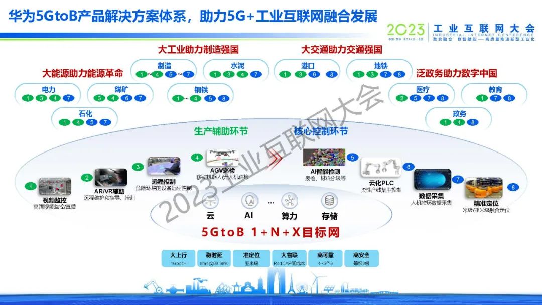 孫震濤表示,5GtoB在過去4年取得了場景、商業、生態、行業、政策、標準六大繁榮,步入發展快車道。華為5GtoB產品解決方案體系以1+N+X目標網為基礎,融合云、AI、算力、存儲等技術,打造可定義、可承諾、可高效交付的網絡基礎設施。其中: