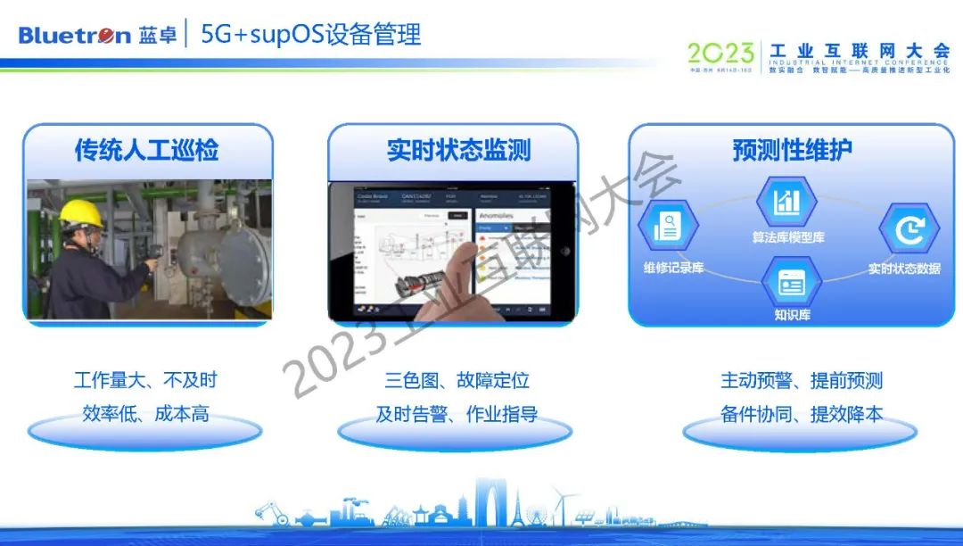 為加速企業(yè)完成生產制造自動化和經營管理自動化,從而走向未來工廠,藍卓不斷探索supOS工業(yè)操作系統(tǒng)與前沿技術的的創(chuàng)新融合,而5G技術為工業(yè)操作系統(tǒng)提供了更多元化的賦能手段和想象空間。目前,supOS圍繞生產、安全、質檢、監(jiān)控等領域,打造了5G+數(shù)字孿生、5G+安全生產、5G+智能巡檢、5G+云化PLC等數(shù)十種場景化應用。