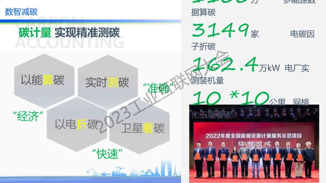 “碳計量,國網推出以能算碳、實時測碳、以電折碳、衛星看碳。其中以能算碳有一套完整的方法論;實時測碳是直接排放的煙囪上安裝了二氧化碳傳感器;以電折碳是通過電力快速折算出二氧化碳的排放;衛星看碳采用歐盟哨兵5P的開源數據,做了整個中國范圍的10×10公里的網格看碳。”
