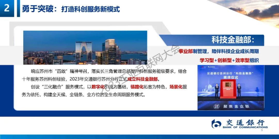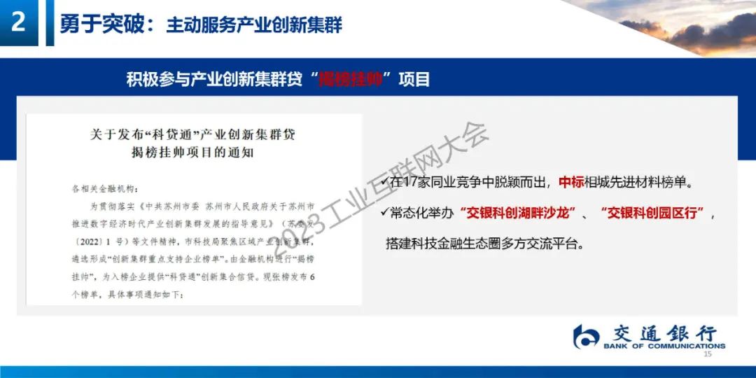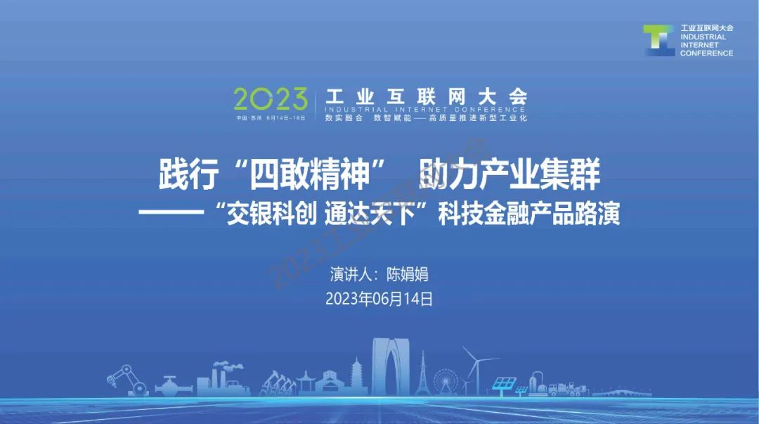 6月14日,在2023工業(yè)互聯(lián)網(wǎng)大會“工業(yè)互聯(lián)網(wǎng)產(chǎn)融推進論壇”上,交通銀行蘇州分行普惠金融事業(yè)部副總經(jīng)理陳娟娟發(fā)表了《踐行“四敢精神”助力產(chǎn)業(yè)集群——“交銀科創(chuàng) 通達天下”科技金融產(chǎn)品路演》的主題演講。