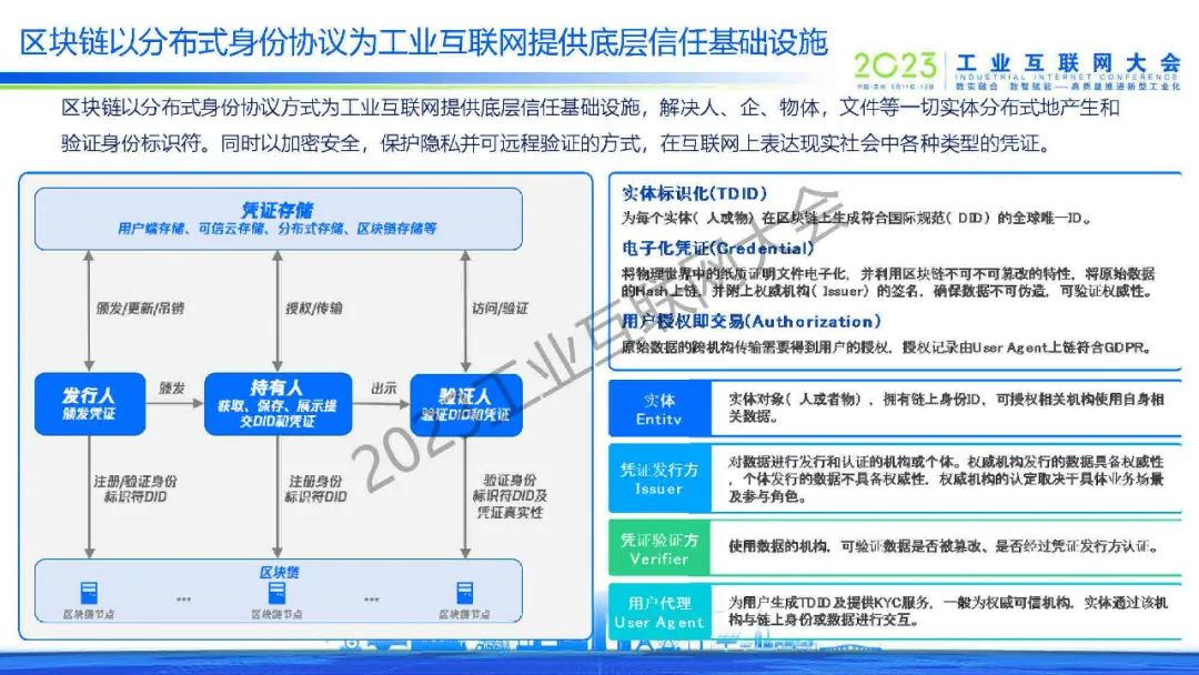 敖萌表示,區(qū)塊鏈以分布式身份協(xié)議方式為工業(yè)互聯(lián)網(wǎng)提供底層信任基礎(chǔ)設(shè)施,解決人、企、物體,文件等一切實體分布式地產(chǎn)生和驗證身份標(biāo)識符。同時以加密安全,保護隱私并可遠(yuǎn)程驗證的方式,在互聯(lián)網(wǎng)上表達(dá)現(xiàn)實社會中各種類型的憑證。