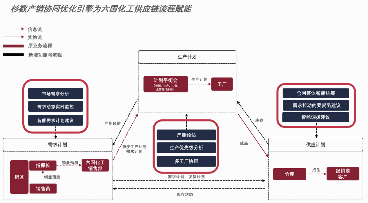 2、基于本項(xiàng)目致力于提升六國(guó)化工的供應(yīng)鏈管理能力,通過(guò)搭建一套產(chǎn)銷協(xié)同系統(tǒng),以先進(jìn)的運(yùn)籌學(xué)優(yōu)化思想與成熟模型來(lái)提升供應(yīng)鏈網(wǎng)絡(luò)的各個(gè)重點(diǎn)節(jié)點(diǎn)管理效率,以領(lǐng)先的杉數(shù)自主研發(fā)的規(guī)劃求解器來(lái)幫助六國(guó)化工提升生產(chǎn)計(jì)劃能力,并統(tǒng)籌管理物流供應(yīng)網(wǎng)絡(luò)、輔助產(chǎn)品預(yù)測(cè)銷量,與SAP ERP及SMS對(duì)接,優(yōu)化需求計(jì)劃、優(yōu)化補(bǔ)貨及庫(kù)存策略、優(yōu)化生產(chǎn)計(jì)劃、實(shí)現(xiàn)產(chǎn)銷協(xié)同模擬,以應(yīng)對(duì)產(chǎn)品需求多樣性的市場(chǎng),實(shí)現(xiàn)提升產(chǎn)銷協(xié)同能力、提高市場(chǎng)響應(yīng)速度即敏捷性、提高投入產(chǎn)出比、提升精細(xì)化管理能力。