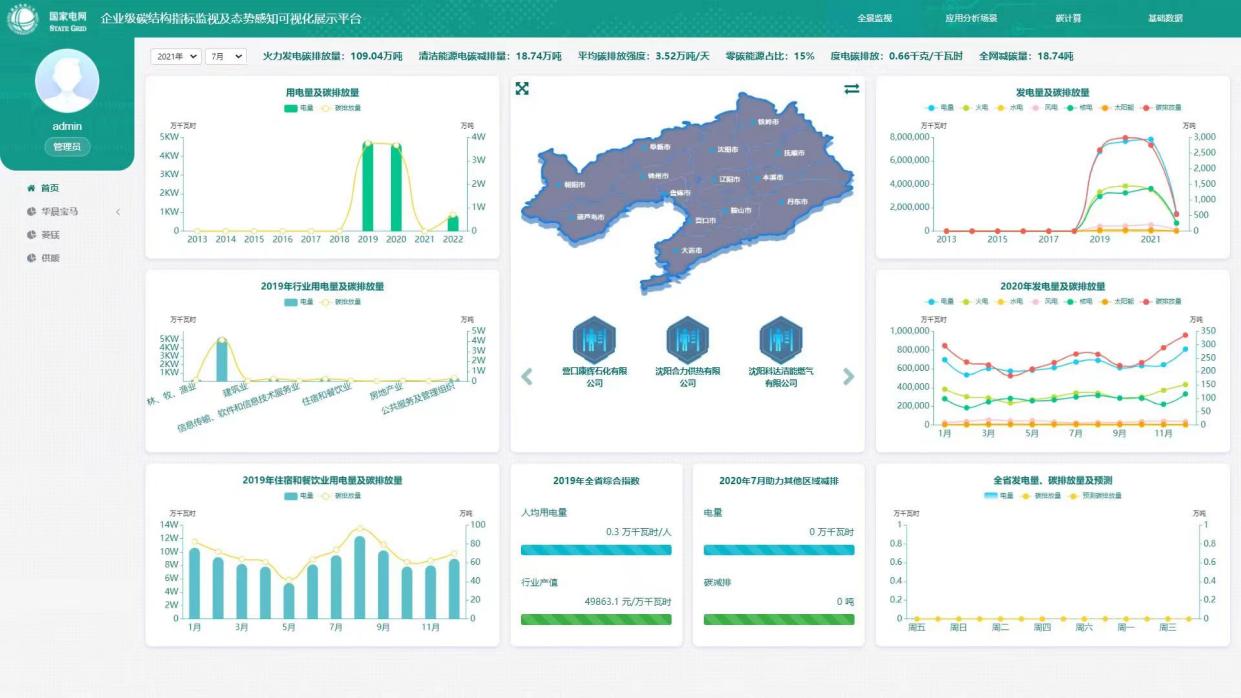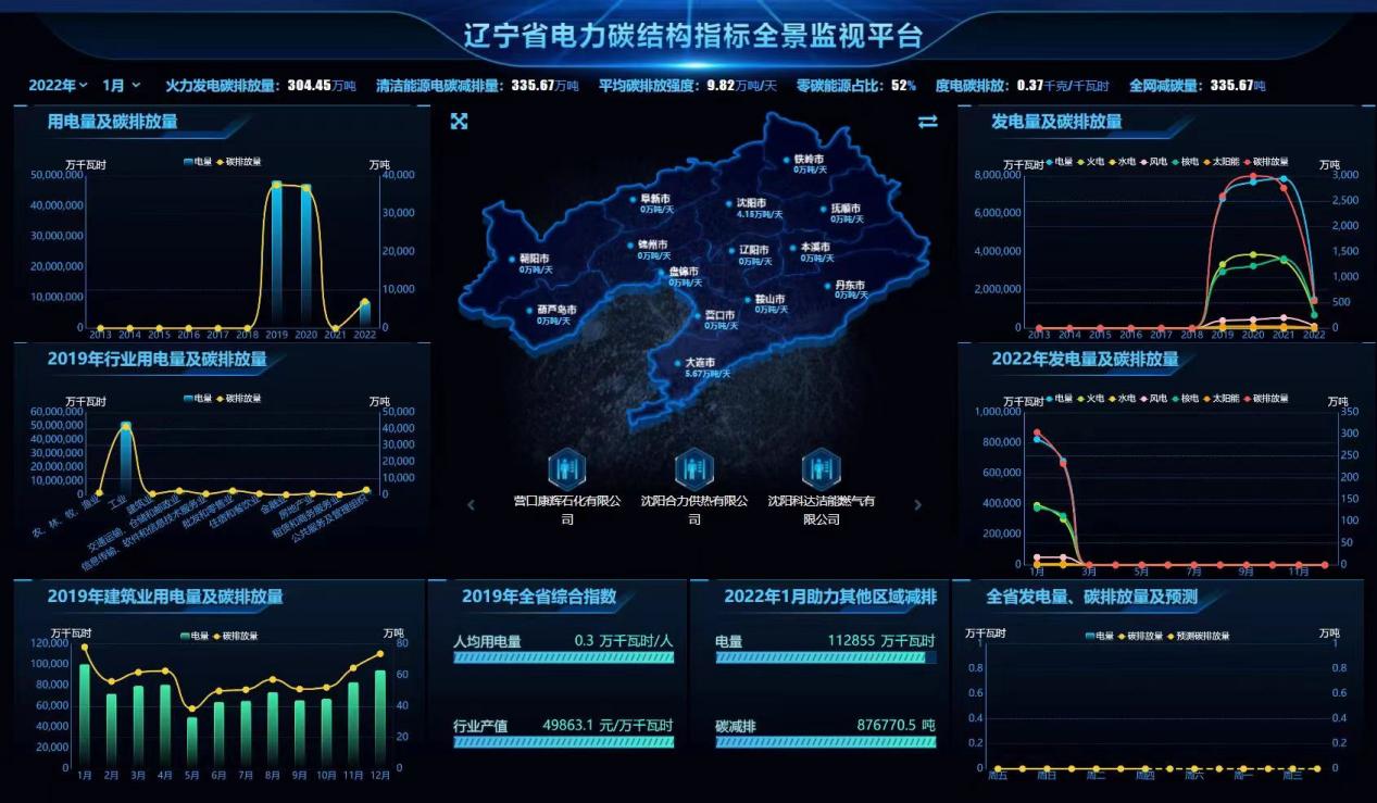 國家發(fā)展和改革委員會應對氣候變化司組織國家應對氣候變化戰(zhàn)略研究和國際合作中心研究確定了中國區(qū)域電網的平均二氧化碳排放因子。平臺基于遼寧省電碳熱力圖,火力發(fā)電碳排放量、平均碳排放強度等20項電碳指標,通過清潔能源占比、碳排放量增量、碳排放速率變化量、外送電量增量、清潔能源消納程度等5個維度,構建區(qū)域“雙碳”綜合指數。通過“雙碳”綜合指數的開發(fā),可以更全面的度量區(qū)域碳排放的實際情況,增加了碳排放管理的科學工具。在“雙碳”綜合指數的應用上,如何支持政府在產業(yè)調整、新上項目、創(chuàng)新發(fā)展等方面的具體決策,科學指導政府規(guī)劃計劃和實際工作落地實施,是輔助城市政府推進“雙碳”工作的重點。