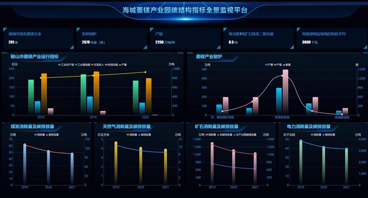 海城菱鎂產業(yè)園是我省優(yōu)勢資源開發(fā)的典型代表,實現碳排放多維度全景監(jiān)視及分析,對加強產業(yè)園的能源監(jiān)管和促進產業(yè)健康發(fā)展意義重大。平臺利用可視化技術實現海城菱鎂產業(yè)園碳排放多維 度全景監(jiān)視及分析,可以有效監(jiān)控企業(yè)的能源消耗和碳排放情況,構建企業(yè)能源消耗與碳排放的相關性分析,提升外在和自身的檢查管理能力,引導企業(yè)節(jié)能減排,為可持續(xù)綠色發(fā)展提供保障。