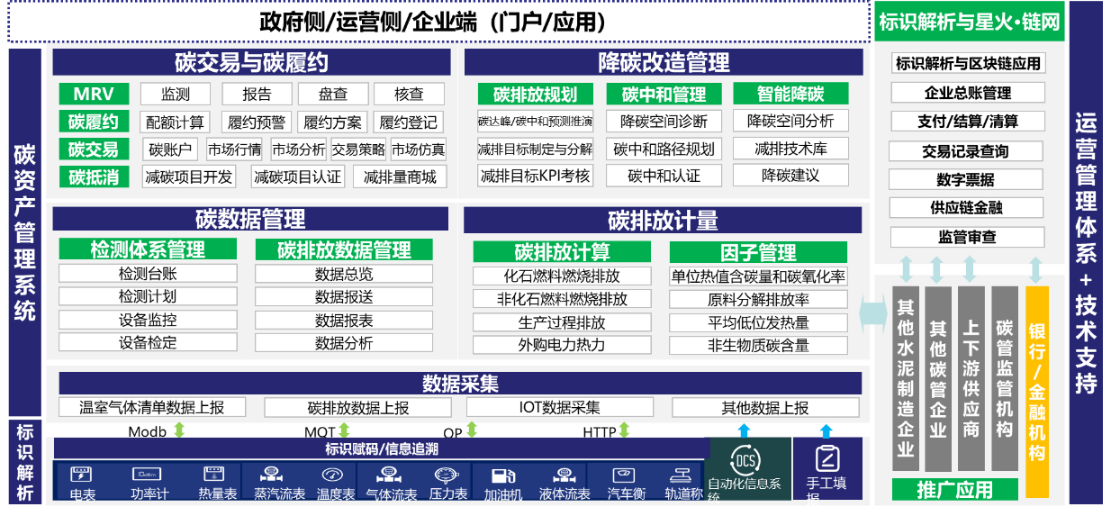 結合水泥行業雙碳管控現狀與各層級碳管控政策要求,本案例融合標識解析、區塊鏈、大數據分析等先進技術,打造水泥行業碳資產管理平臺,制定碳排放管控、低碳轉型目標與階段性計劃,實現碳管制度體系建設、碳排放精細化管理、碳資產管理、碳排放預測等。