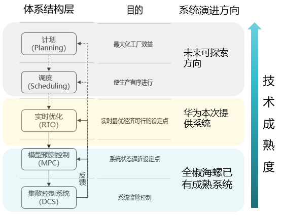 基于5G+工業互聯網思路和降低碳排放的需求,進一步改善現有系統的自動程度與能耗優化能力,在現有MPC系統之上建設水泥燒成及原料粉磨能耗優化系統(RTO)。該系統是一個基于原水泥窯、磨MPC系統之上的工藝參數優化系統(如下圖所示),是對現有成熟MPC系統的進一步優化,最終實現對窯、磨系統的穩定且低耗的自動駕駛,能夠有效降低CO2排放,提升生產效率。