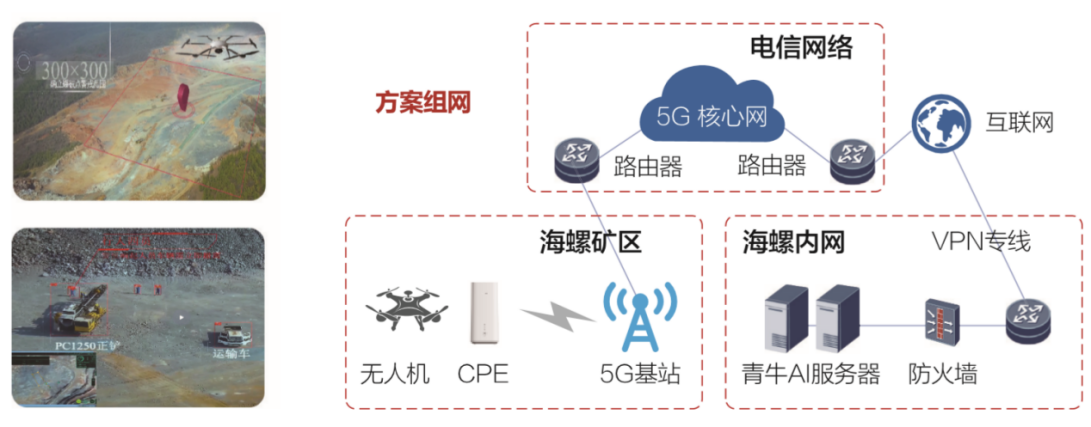 無人機通過5G 將監控到的礦場高清視頻傳送到天翼云上AI平臺進行分析,當分析到爆破范圍內有人或者設備,AI系統將通過一體化AI平臺進行報警,爆破完成后,無人機采集地形變化,更新3D模型,指導后續爆破和開采。