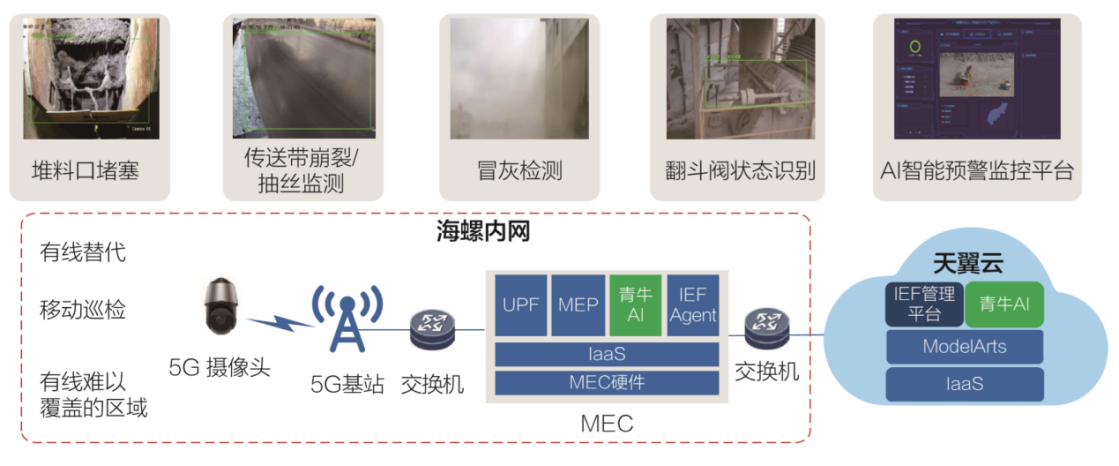 利用5G的大帶寬、高可靠性特點,對水泥制造和園區安全,生產過程中需要人力監控的點進行了判斷,通過AI開發出專門算法,在堆料口堵塞,傳動帶崩裂檢測,冒灰污染檢測,翻斗閥檢測等方式進行了機器視覺應用開發,同時針對園區人員不安全行為,也都增加了AI 安全檢測,當報警達到閾值,或AI識別出人員不安全行為,會實時告警。