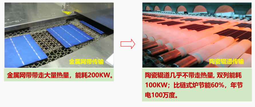 基于陶瓷輥道的超低能耗太陽能光伏電池燒結爐,通過材料創新與工藝創新,使用陶瓷輥道代替金屬網帶,將太陽能光伏電池燒結環節能耗從200kW降低至90kW,節能達到50%至60%,單臺爐每年節約電能100萬千瓦時。當前解決方案已在南昌大學等院校及研究機構,順風光電、天合、隆基、晶澳、晶科、陽光中科、騰暉等上市公司中使用。